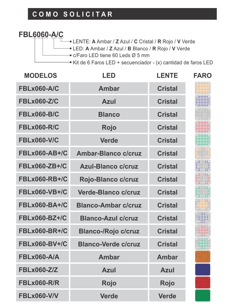 *Colores disponibles de LED: Ámbar, Azul, Blanco, Rojo, Verde y combinaciones personalizadas.