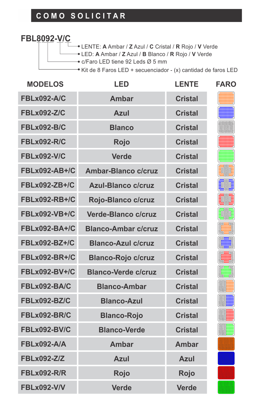 *Colores disponibles de LED: Ámbar, Azul, Blanco, Rojo, Verde y combinaciones personalizadas.