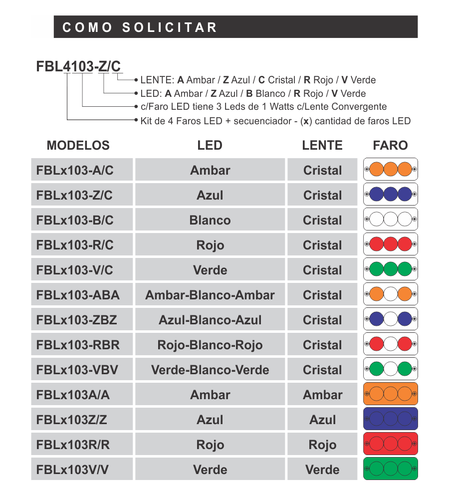 *Colores disponibles de LED: Ámbar, Azul, Blanco, Rojo, Verde y combinaciones personalizadas.