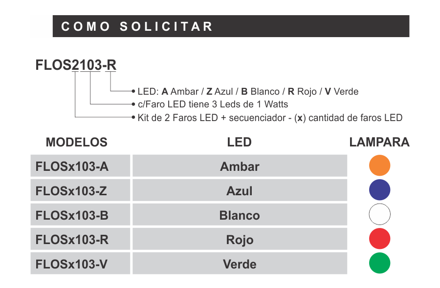 *Colores disponibles de LED: Ámbar, Azul, Blanco, Rojo, Verde y combinaciones personalizadas.