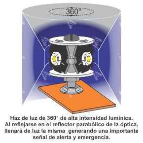 La emisión lumínica de 360°, de esta lámpara LED, combinado con el reflector de las ópticas del vehículo, permite obtener un efecto de alta intensidad y llenado lumínico de las mismas, que potenciado por el efecto estroboscópico generado por el comando secuencial, genera una importante señal de alerta y emergencia en el vehículo.
