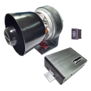 Sirena electrónica de gran nivel sonoro, modelo SE757 de MEGASION. Posee electrónica de estado sólido, 75 Watts de potencia, con 7 (siete) sonidos de emergencia y un segundo pulsador con seguidor de sonido. Módulo electrónico generador de sonidos, separado de la bocina.